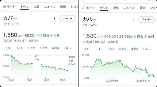 ホロライブ所属の大物VTuber天音かなたさんの突然の卒業に関するお知らせが出たことでカバー株式会社の株価はかなたんショック😱💦株価が大幅に下落しております。 pic.twitter.com/PI79IQxnKU
