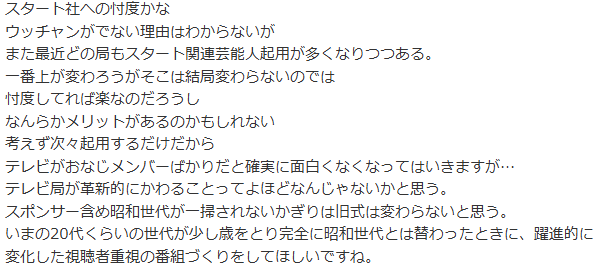 - メインの司会者の代わりに忖度してSTARTOのタレント出しても番組的になんの得もない。