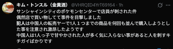 • 3階で家族とご飯食べて19時半前に2階にある本屋に行こうとエレベーター降りたらポケセンに警察いっぱいいて「死ぬぞー」って男の人の叫び声して「?」って言って「犯人がいるので逃げてください!」って言われたら店員さんにあったのか聞いたら「殺傷事件っぽいですちょっとで逃げたほうがいい」です」って言われてドキドキしながらベビーカー押す夫と逃げ帰ってきた。日中お子を抱っこして二人でポケセンウロウロしてたから2人の時だったらパニックだったろうな。血が着いたスタッフさんも見えて本当に恐怖だった。真上でゆっくりご飯食べてて絵本買おうと降りたら地獄絵図で今日は心臓が痛い